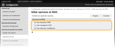 2 | Configure las opciones según sus necesidades. ![]() [Usar impresión WSD] Seleccione la casilla de verificación para imprimir a través de WSD. Cuando no utilice la impresión WSD, quite la marca de la casilla de verificación. [Usar navegación WSD] Seleccione la casilla de verificación para obtener información sobre el equipo desde un ordenador a través de WSD. Esta casilla de verificación se selecciona automáticamente cuando se marca la casilla de verificación [Usar impresión WSD]. [Usar detección multidifusión] Seleccione la casilla de verificación para configurar el equipo de forma que conteste a los mensajes de detección multidifusión. Cuando se quite la marca de la casilla de verificación, el equipo permanecerá en el modo de reposo incluso cuando los mensajes de detección multidifusión fluyan a través de la red. |