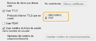 Seleccione la casilla de verificación [Usar TTLS] o [Usar PEAP].