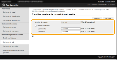 Para configurar o cambiar la contraseña, seleccione la casilla de verificación e introduzca caracteres alfanuméricos para la nueva contraseña en los cuadros de texto [Contraseña] y [Confirmar]. |