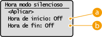 Especifique una hora para salir del modo silencioso. Para establecerla, seleccione <On> y, a continuación, especifique la hora.