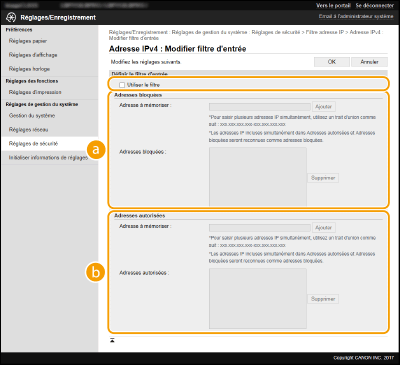 En cas de saisie incorrecte des adresses IP, vous risquez de ne pas pouvoir accéder à l'appareil via l'IU distante. Si cela devait se produire, il faudrait définir <Filtre d'adresse IPv4> ou <Filtre d'adresse IPv6> sur <Désactivé>. <Filtre d'adresse IPv4><Filtre d'adresse IPv6>