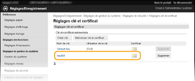 Il est impossible de supprimer une clé avec certificat en cours d'utilisation pour une fonction, comme par exemple lorsque "[TLS]" s'affiche sous [Utilisation de la clé]. Dans un tel cas, désactivez la fonction ou remplacez la clé avec certificat avant de la supprimer.