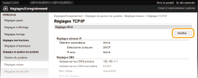 Vous pouvez modifier les réglages de l'appareil par le biais de l'IU distante. Il est possible de configurer la plupart des réglages au niveau de l'appareil lui-même, mais certains d'entre-eux doivent être modifiés par l'IU distante. Cette section décrit la procédure générale pour modifier les réglages de l'appareil depuis l'IU distante.