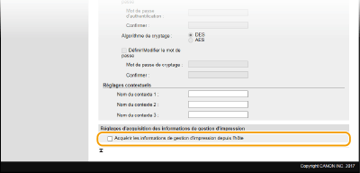 Définissez les réglages d'acquisition des informations de gestion d'imprimante.