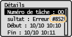 Si une erreur survient, par exemple si l'impression échoue , un code d'erreur à trois chiffres s'affiche dans l'écran Journal des tâches. Consultez cette section pour connaître les causes et les solutions possibles pour chaque code d'erreur. Pour en savoir davantage sur l'écran Journal des tâches, consultez la section