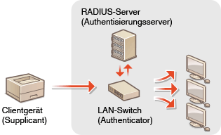 Die Authentisierungsdaten werden an einen RADIUS-Server übermittelt und dort geprüft, und je nach Ergebnis wird die Kommunikation mit dem Netzwerk zugelassen oder abgewiesen. Wenn die Authentisierung fehlschlägt, blockiert ein LAN-Switch oder Access Point den Zugriff von außerhalb des Netzwerks. Das Gerät kann als Client mit einem 802.1X-Netzwerk verbunden werden.