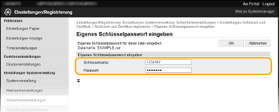 Wählen Sie [Sicherheitseinstellungen]  [Einstellungen Schlüssel und Zertifikat] oder [Einstellungen CA-Zertifikat].