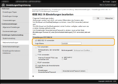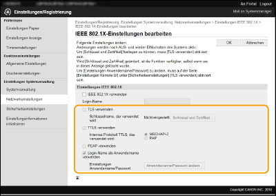 Bei dieser Authentisierungsmethode werden für die Clientauthentisierung ein Anwendername und ein Passwort verwendet und für die Serverauthentisierung wird ein Zertifizierungsstellenzertifikat verwendet. Als internes Protokoll stehen MSCHAPv2 und PAP zur Auswahl. TTLS kann zusammen mit PEAP verwendet werden. Aktivieren Sie TLS für Remote UI, bevor Sie diese Authentisierungsmethode konfigurieren (