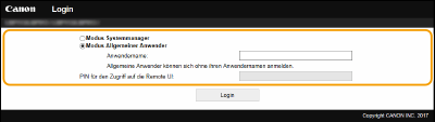 Wenn [PIN für den Zugriff auf die Remote UI] eingestellt ist, geben Sie die PIN ein.