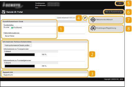Wenn Sie sich bei Remote UI anmelden, erscheint die folgende Portalseite. In diesem Abschnitt werden die auf der Portalseite angezeigten Elemente und die Grundfunktionen erläutert.