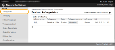 Wenn Sie sich im Modus Systemmanager angemeldet haben, werden alle Druckdokumente aufgelistet, die gerade gedruckt werden oder sich in der Druckwarteschlange befinden.