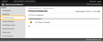 Wenn ein Fehler auftritt, können Sie diese Seite aufrufen, indem Sie auf der Portalseite (Hauptseite) auf die Meldung unter [Fehlerinformationen] klicken.