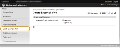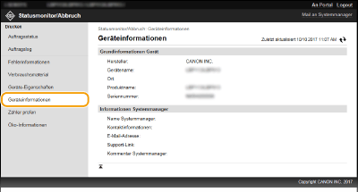 Informationen über das Gerät und den Systemmanager werden angezeigt. Diese Informationen legen Sie auf der Seite [Einstellungen/Registrierung] unter [Systemverwaltung] fest.
