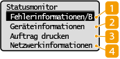 Wenn Sie <Statusmonitor> wählen, wird ein Bildschirm angezeigt, auf dem Sie den Fortschritt der Dokumentenverarbeitung sowie den Status des Geräts (die Menge des in der Tonerpatrone verbliebenen Toners usw.) und die Netzwerkeinstellungen, wie beispielsweise die IP-Adresse des Geräts, überprüfen können.