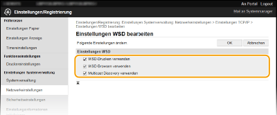 Aktivieren Sie das Kontrollkästchen, wenn Sie über WSD von einem Computer aus Informationen über das Gerät abrufen wollen. Dieses Kontrollkästchen wird automatisch aktiviert, wenn Sie das Kontrollkästchen [WSD-Drucken verwenden] aktivieren. [Multicast Discovery verwenden]