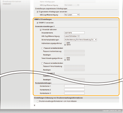 SNMP (Simple Network Management Protocol) ist ein Protokoll zum Überwachen und Steuern von Kommunikationsgeräten in einem Netzwerk über die MIB (Management Information Base). Das Gerät unterstützt SNMPv1 und das mit Sicherheitsmechanismen ausgestattete SNMPv3. Sie können den Status des Geräts von einem Computer aus anzeigen, wenn Sie Dokumente drucken oder Remote UI verwenden. Sie können SNMPv1 oder SNMPv3 oder beide Versionen gleichzeitig aktivieren. Legen Sie die Einstellungen für jede Version je nach Netzwerkumgebung und Verwendungszweck fest.