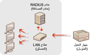 يتم إرسال معلومات المصادقة إلى الخادم RADIUS والتحقق منها، حيث يسمح بالاتصال بالشبكة أو يرفضه تبعًا لنتيجة المصادقة. إذا أخفت المصادقة، يمنع مفتاح شبكة LAN (أو نقطة وصول) الدخول من خارج الشبكة. يمكن للجهاز الاتصال بشبكة 802.1X بوصفه جهاز عميل.