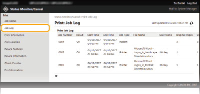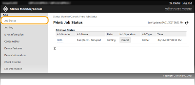 إذا قمت بتسجيل الدخول في وضع مدير النظام System Manager Mode، فإنه سيتم سرد كل مستندات الطباعة التي تتم طباعتها حاليًا والتي في انتظار طباعتها.