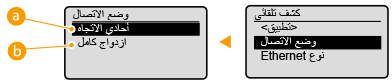حدد وضع الاتصال.![]() <أحادي الاتجاه>يرسل ويستلم بيانات الاتصال بالتناوب. اختره عندما يتم توصيل الجهاز بجهاز الشبكة باستخدام النصف مزدوج.
