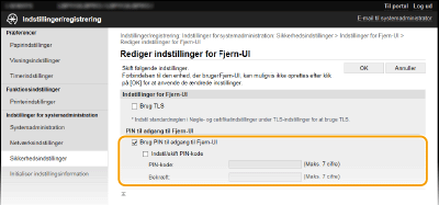 ![]() Brug af kontrolpaneletDer er også adgang til indstillinger for PIN til adgang til Fjern-UI fra <Menu> på skærmbilledet Hjem. <Indstillinger for Fjern-UI>