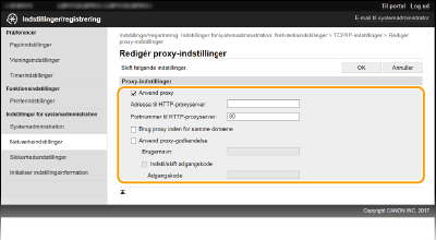 Du kan angive eller ændre adgangskoden for proxygodkendelse, når den er aktiveret, ved at markere afkrydsningsfeltet og indtaste alfanumeriske tegn for den nye adgangskode i tekstfeltet [Adgangskode].