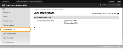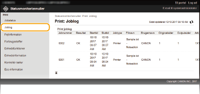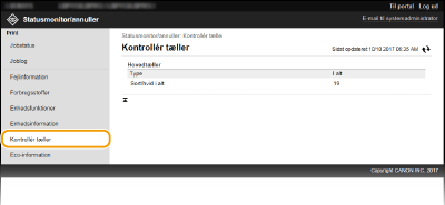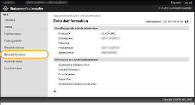 Oplysninger om maskinen og systemadministratoren vises. Disse oplysninger indstilles i [Systemadministration] på siden [Indstillinger/registrering].