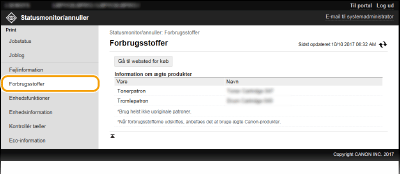 Information om forbrugsstoffer som f.eks. modelnummer for patronen vises. Du kan også klikke på [Kontrollér detaljer om forbrugsstoffer] på portalsiden (hovedsiden) for at få vist denne side (