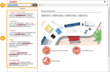 for at få vist søgevinduet. Indeholder et tekstfelt til søgning med søgeord efter den side, du skal bruge.