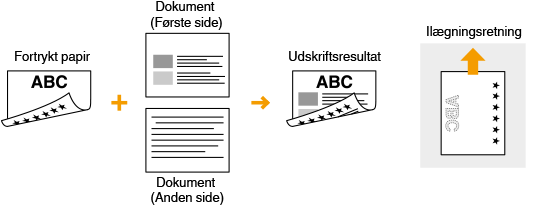 I dette afsnit beskrives primært, hvordan du ilægger fortrykt papir, så den rigtige side vender opad, og papiret ligger i den rigtige retning. Under Ilægning af papir i skuffen eller Ilægning af papir i universalbakken findes en beskrivelse af den generelle fremgangsmåde for ilægning af papir i skuffen.