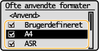 Sørg for, at det kun er afkrydsningsfelterne for ofte anvendte papirformater, der er markeret.