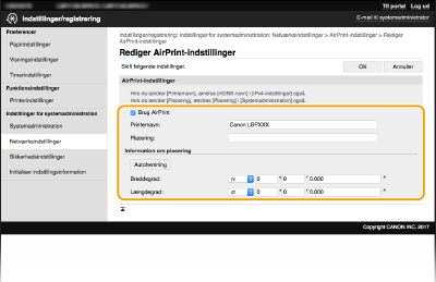 Gør det muligt for dig at kontrollere de værdier, der er indtastet i AirPrint-indstillingerne, som f.eks. maskinens navn og lokation. Du kan klikke på [Rediger] for at ændre indstillingerne.