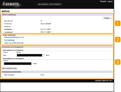 Når du logger ind med administratorrettigheder, vises den AirPrint-dedikerede side som vist nedenfor.