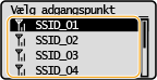 Du kan søge efter trådløse routere (eller adgangspunkter), der kan oprette forbindelse, og vælge én på maskinens display. Få netværksnøglen ved at indtaste en WEP-nøgle eller PSK. Før du vælger en trådløs router, skal du kontrollere og skrive de nødvendige konfigurationsoplysninger, herunder SSID og netværksnøglen, ned (
