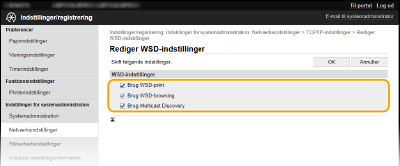 Markér afkrydsningsfeltet for at hente oplysninger om maskinen fra en computer via WSD. Afkrydsningsfeltet markeres automatisk, når afkrydsningsfeltet [Brug WSD-print] er markeret. [Brug Multicast Discovery]