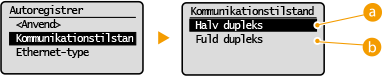 vælg kommunikationstilstand.![]() <Halv dupleks>Skiftevis sender og modtager kommunikationsdata. Vælges, når maskinen er tilsluttet til en netværksenhed ved hjælp af halv dupleks.