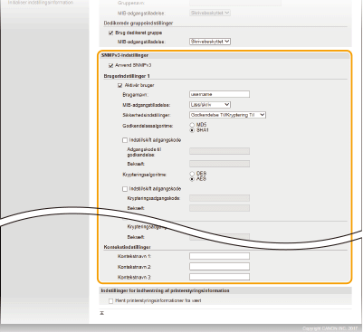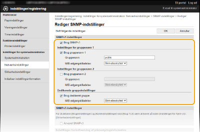 Hvis begge SNMP-versioner er aktiveret, anbefales det, at MIB-adgangstilladelse i SNMPv1 angives til [Skrivebeskyttet]. MIB-adgangstilladelsen kan indstilles uafhængigt i SNMPv1 og SNMPv3 (og for hver bruger i SNMPv3). Hvis [Læs/skriv] (fuld adgangstilladelse) vælges i SNMPv1, negerer det de robuste sikkerhedsfunktioner, der er et kendetegn ved SNMPv3, fordi de fleste af maskinindstillingerne så kan kontrolleres med SNMPv1.