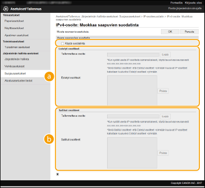 Jos IP-osoitteet on syötetty väärin, et ehkä pysty käyttämään laitetta etäkäyttöliittymästä, missä tapauksessa sinun on määriteltävä <IPv4-osoitesuodatin> tai <IPv6-osoitesuodatin> asetukseen <Ei>. <IPv4-osoitesuodatin><IPv6-osoitesuodatin>