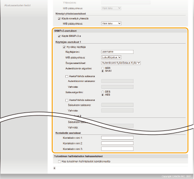 SNMP (Simple Network Management Protocol) on protokolla, jolla valvotaan ja ohjataan verkon tiedonsiirtolaitteita käyttämällä MIB:tä (Management Information Base). Laite tukee SNMPv1-protokollaa ja edistyneemmän suojauksen SNMPv3-protokollaa. Voit tarkistaa laitteen tilan tietokoneesta, kun tulostat asiakirjoja tai käytät Etäkäyttöliittymää. Voit ottaa käyttöön SNMPv1:n, SNMPv3:n tai molemmat samanaikaisesti. Määritä kunkin version asetukset verkkoympäristöön ja käyttötarkoitukseen sopiviksi.