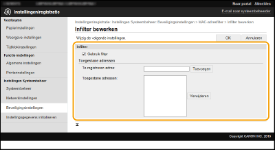 Als u MAC-adressen verkeerd invoert, kunt u het apparaat mogelijk niet bereiken vanuit de externe UI. Om dat op te lossen, moet u <MAC-adresfilter> instellen op <Uit>. <MAC-adresfilter>