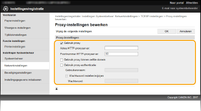 Als u het wachtwoord voor proxyverificatie wilt instellen of wijzigen, schakelt u het selectievakje in en typt u alfanumerieke tekens voor het nieuwe wachtwoord in het vak [Wachtwoord].