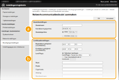 U kunt een sleutelpaar genereren met het apparaat als dit nodig is voor gecodeerde communicatie via TLS (Transport Layer Security). U kunt TLS gebruiken wanneer u het apparaat gebruikt via de externe UI. Zelf-ondertekende certificaten worden gebruikt bij de sleutel en certificaat die zijn gegenereerd in "Netwerkcommunicatie".