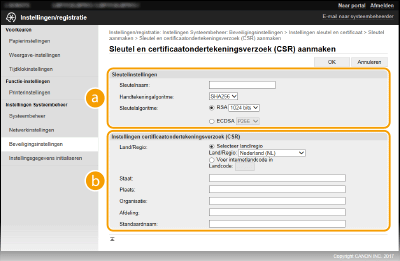 Op het apparaat gegenereerde certificaten hebben geen CA-handtekening, een communicatiefout kan het gevolg zijn, afhankelijk van de apparaten waarmee het communiceert. Voordat de certificeringsinstantie het certificaat met CA-handtekening kan afgeven, moet u CSR-gegevens (Certificate Signing Request) verkrijgen die de beheerder van de externe UI kan genereren. Als het certificaat is verstrekt, registreer het dan in de sleutel met de gegenereerde CSR.