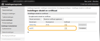 U kunt een sleutelpaar niet verwijderen als dit momenteel in gebruik is, bijvoorbeeld wanneer "[TLS]" wordt weergegeven onder [Sleutelgebruik]. In dat geval moet u de functie uitschakelen of het sleutelpaar vervangen voordat u het sleutelpaar kunt verwijderen.