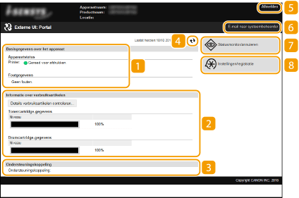 Hier ziet u de huidige status van de machine en foutgegevens. Als er een fout is opgetreden, wordt er een koppeling weergegeven naar de pagina Foutgegevens.