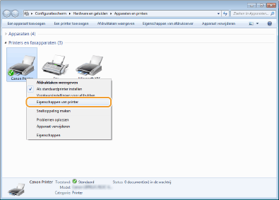 Klik met de rechtermuisknop op het pictogram van het printerstuurprogramma voor dit apparaat en klik op [Eigenschappen van printer] of [Eigenschappen].