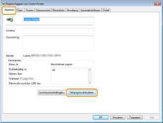 Klik op [Testpagina afdrukken] op het tabblad [Algemeen].