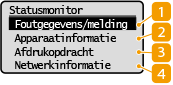 Wanneer u <Statusmonitor> selecteert, wordt er een scherm weergegeven waarin u de voortgang kunt controleren van documenten, en ook de status van het apparaat (resterende hoeveelheid in de tonercartridge, enzovoort) en netwerkinstellingen, zoals het IP-adres van het apparaat.