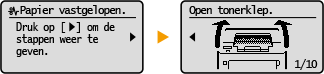 In sommige gevallen worden, wanneer er een fout optreedt, instructies weergegeven over hoe u moet reageren. Volg de aanwijzingen op het scherm voor het oplossen van het probleem. Het scherm dat wordt weergegeven wanneer er zich een papierstoring voordoet, wordt hieronder getoond als voorbeeld.