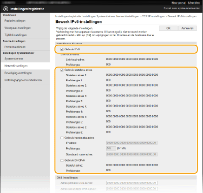 De IPv6-adressen van het apparaat kunnen worden geconfigureerd via de externe UI. Voordat u IPv6-adressen instelt, moet u de instellingen voor het IPv4-adres controleren (IPv4-instellingen weergeven). U moet de juiste IPv4-instellingen opgeven om te kunnen werken met IPv6-adressen. Het apparaat kan de onderstaande IPv6-adressen gebruiken: