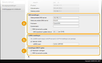 mDNS (multicast DNS) wordt ondersteund door Bonjour en is een protocol voor het koppelen van een hostnaam aan een IP-adres zonder DNS te gebruiken. Schakel dit selectievakje in om mDNS in te schakelen en voer de mDNS-naam in het vak [mDNS-naam] in. [Instellingen DHCP-opties][Hostnaam verkrijgen]